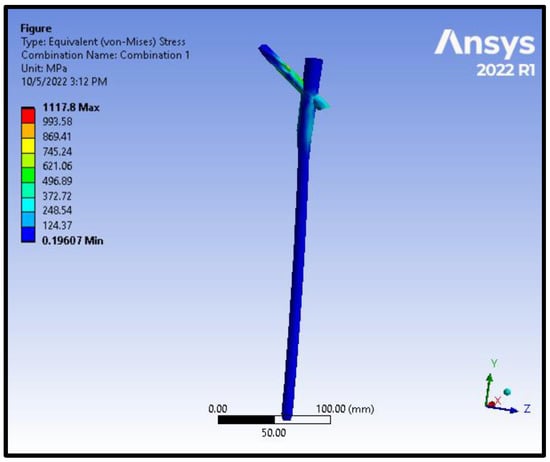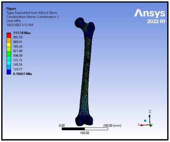 A physical examination of the models was beneficial in identifying areas with high levels of stress. The visual representation was a helpful tool in assessing the validity of the results. Figure 7, Figure 8, Figure 9, Figure 10, Figure 11 and Figure 12 represent the von Mises stress, total deformation, and shear stress distribution on the femoral model and on the nail and the helical screw in the intracapsular fracture under axial compression and torsion scenario.