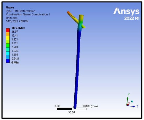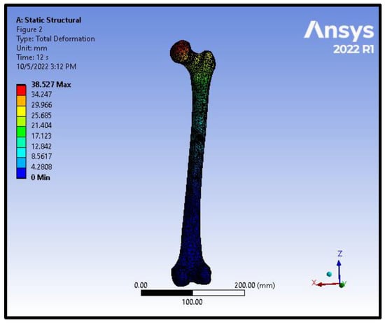 Total deformation distribution on the femoral model in an intracapsular fracture under axial compression and torsion scenario.