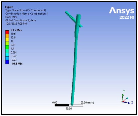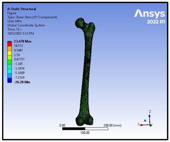 Shear stress distribution on the femoral model in an intracapsular fracture under axial compression and torsion scenario.