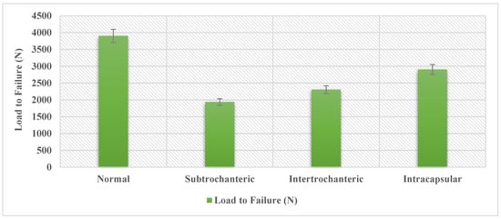 The data produced from the finite element analysis can provide a comparison of how fracture type influences the internal forces in the nail. Using the weight of the average adult male, 800 N [], and the average torsion experienced during walking, 13 Nm [], the data can be expressed as a ratio of average body weight and average torsion. A femur with a complete subtrochanteric fracture fairs the worst, only being able to withstand 1935.88 N, just 2.42 times the average weight of an adult male. When factoring in the torsion that would be present in a realistic loading scenario, the loading needed to fail was reduced to 3510.78 N, a 10% decrease. The subtrochanteric fracture again shows the largest change, decreasing to 1838.02 N. That is a 5% reduction with only being able to withstand 2.3 times the body weight of an adult male. The information generated also gives some insight into how different fractures influence the stress produced within the intramedullary nail. When comparing the fracture types to the normal femur model, the subtrochanteric, intertrochanteric, and intracapsular have a 50%, 41%, and 26% decrease in max load-to-failure, respectively. The data also show that when adding torsion, the intracapsular fracture demonstrated almost no change in the load to failure. The added torsion did, however, have a significant effect on decreasing the load to failure in the other fracture types. When considering the effect of the gait cycle on the nail, the data show that all the femur models were experiencing loads of up to 420–580 MPa, depending on the fracture type. The fatigue limit of the titanium alloy Ti-6Al-7Nb is 580 per 106 cycles []. When considering that there is only one fracture type that produces stress in this range, it is possible that the subtrochanteric fracture loads the nail beyond the fatigue limit of the material. When loading is at the threshold, it will take 10 million loading cycles before the material fails. This would take more time than what is needed for the nail to heal the fracture, as these types of internal fixation devices are not designed to be used indefinitely. It is important to note that these tests consider that the nail is without any damage. While the device is not likely to fail from the cyclic loading from walking on its own, this could change if the device is damaged.