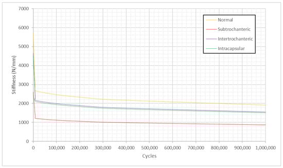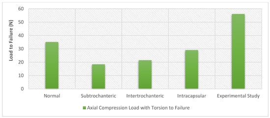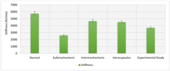 A comparison with previous experimental work was performed, and stiffness and displacement were measured for all the models under the torsion scenario. The experimental work, which was performed at a biomechanics laboratory, included 28 pairs of cadaveric femurs with fixation devices. Although, only the models with long titanium nails (7 pairs) were included in the evaluation. This comparison focuses on comparing the effect on the bone and nail, as it was essential to explore the computational simulation variations in bone stiffness with the experimental results to validate the simulation when taking the material of the device into consideration. In order to measure the stiffness of the femoral bone model with intertrochanteric fracture, data were generated from 29,053 elements and were then analysed. The same procedure was performed on all the other models. It appears that the mean stiffness of the normal femoral bone model was 5735.503 N/mm; for the femoral bone model with subtrochanteric fracture, it was 2605 N/mm; for the femoral bone model with intertrochanteric fracture, it was 4654.359 N/mm, and for the femoral bone model with intracapsular fracture, it was 4518.769 N/mm. On the other hand, if we look into the stiffness of the undamaged bone, it would be 4864 N/mm [], which is in good agreement with the current computational simulation results. The results illustrate that the load to failure was 37% higher in the experimental work than in the normal model computational simulation and 48% higher than in the intracapsular model simulation. Additionally, the results demonstrate that the stiffness was 30% higher in the experimental work than in the subtrochanteric model simulation and 22% lower than in the intracapsular model computational simulation. The difference in stiffness could be a consequence of the deformation between the grips in the experimental work and the point-to-point in the finite element simulations. Despite this, the results can be considered satisfactory with a degree of confidence, and the finite element simulations were in good agreement with the previous experimental work, as shown in Figure 16 and Figure 17. Furthermore, Figure 16 demonstrates that the highest stiffness in the normal model computational simulation and the decrease in stiffness as the fracture moves away from the head of the femur are the lowest in the subtrochanteric model.