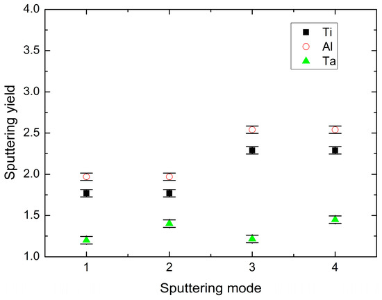 The chemical compositions of the Ti-Al-Ta-N coatings deposited in different sputtering modes determined by EDS are listed in Table 1. It can be seen that, despite similar average cathode power densities, the composition of the coatings varies significantly. This effect is mainly caused by two origins. The first is concerned with different sputtering yields of the target materials in the different sputtering modes. The estimation of the sputtering yield of the chemical elements constituting the targets was performed using the following equation [67]: