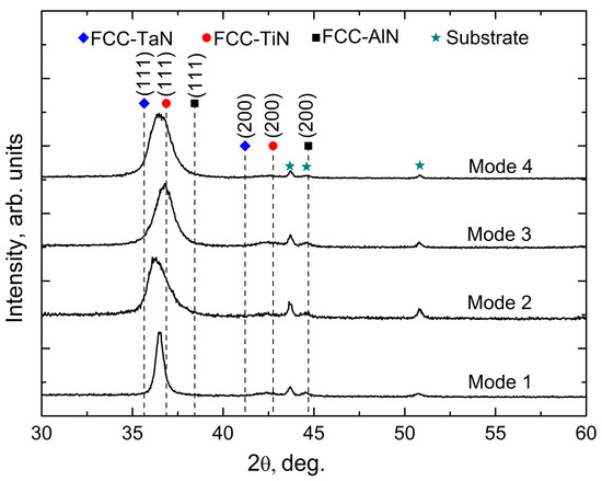 Standard Gibbs free energy of formation of TiN (−308.3 kJ/mol) is more negative than those of AlN (−287.0 kJ/mol) and TaN (−187 kJ/mol) [68,69]. Therefore, it can be supposed that the Ti-Al target was most strongly “poisoned” in the Ti-enriched areas during the sputtering process. This led to a rapid drop in the number of Ti atoms in the flux of the sputtered species compared with the Al and Ta atoms, which were still predominantly sputtered in the metallic mode. This effect was earlier revealed in magnetron-sputtered Ti-Al-N coatings, where pronounced changes in the Al/Ti ratio were observed under a varying partial pressure of nitrogen [70]. Evidently, the “poisoning” was substantially more pronounced in the DCMS mode since, in this case, the charging of the dielectric nitride layers on the target surface occurred continuously. In the case of the pulsed bipolar magnetron sputtering, the nitride layers discharged during the period when a positive potential was applied to the target due to an electron current from the deionizing plasma. This resulted in a weaker shielding of the Ti-enriched areas of the Ti-Al target and, consequently, in an increase in the fraction of Ti atoms in the sputtered flux. Therefore, the Ti content in the coatings increased from 39.3% in mode 1 to 43.7% in mode 3 and 46.5% in mode 4.