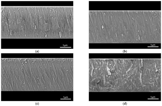 Cross-sectional SEM micrographs of Ti-Al-Ta-N coatings obtained in different sputtering modes: (a) mode 1, (b) mode 2, (c) mode 3, and (d) mode 4.