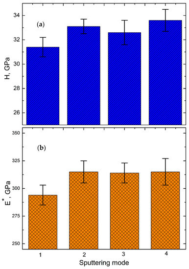 The hardness and reduced Young’s modulus of the coatings determined through the instrumented nanoindentation are shown in Figure 4. The presented results indicate that the middle-frequency magnetron sputtering provides an increase in H and E*. The hardness of the coatings sputtered in modes 2–4 is 1–2 GPa higher compared with that deposited in mode 1, with the coating obtained in pure MFMS mode having the highest hardness. The observed increase in the hardness can be attributed to the reduced average crystallite size of the coatings deposited in modes 2–4, as it was evidenced by the XRD investigations. It is known that the decrease in the crystallite size down to 10–20 nm enhances the hardness of polycrystalline materials due to hindering the dislocation motions because of the increasing boundary areas and the formation of dislocation pile-ups (Hall–Petch effect) [73,74]. The Young’s modulus of the coatings deposited in modes 2–4 increases by 10% compared with that sputtered in mode 1, which can be attributed to the densification of their structure.