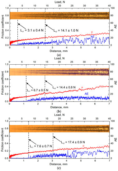 Scratch testing of the coatings has revealed that the moving stylus induces plastic ploughing of the material of the steel substrate from the bottom of the scratch groove toward its flanks. This results in the formation of pile-ups along the scratch flanks, which is accompanied by coherent bending of the coatings. As shown in Figure 5, the coating failure starts from the formation of conformal cracks inside the scratch grooves. They are semicircular forward cracks caused by compressive stresses arising ahead of the moving stylus, resulting in the formation of the pile-up in this area. Due to the rigid bonding between the coating and the substrate, the former bends in the pile-up area, leading to rising tensile stresses in its surface layer, resulting in coating cracking at the periphery of the contact area. Tensile backward cracks also form at higher loads inside the scratch tracks, which are induced by the total effect of the friction force and the bending of the coatings around the contact area.