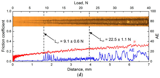 The effect of the deposition modes on the mechanisms of crack resistance and the adhesion of the coatings was evaluated through scratch testing using a Revetest instrument (CSM instruments, Peseux, Switzerland) equipped with a conical Rockwell stylus, which had an angle at the apex of 120° and a tip curvature radius of 200 µm. Two samples of each type of coating were tested. Three scratch tests were carried out for each sample. The scratches were made 7 mm long with a sliding speed of 2 mm/min. The loading speed was 11.4 N/min, and the maximum applied load was 40 N.