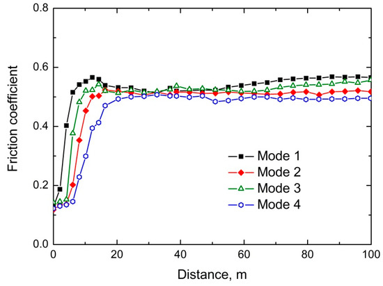 Friction coefficient of the Ti-Al-Ta-N coatings obtained in different sputtering modes as a function of sliding distance.