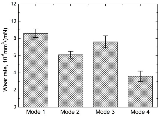 Figure 7 shows the wear rate of the Ti-Al-Ta-N coatings sputtered in different modes. It is seen that the coatings deposited in MFMS and hybrid modes (modes 2–4) are characterized by improved wear performance compared with the DCMS coating. The MFMS coating has the lowest wear rate, which is 2.4 times lower than that of the DCMS coating. Considering the above-described results, the improved wear performance of the MFMS Ti-Al-Ta-N coating can be primarily attributed to the modification of its microstructure. Hindering the formation of columnar grains with low-density boundaries and reducing the crystallite size resulted in the densification of the MFMS coating, which provided its increased hardness in combination with improved toughness. In addition, the absence of the through-thickness boundaries between columns significantly suppressed the propagation of cracks toward the substrate, enhancing the resistance of the coating to chipping and delamination. All of these factors contribute to its increased resistance to scratching and abrasion.