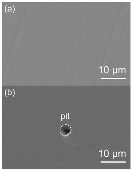Figure 1 exhibits the SEM images of the surface of the sample before and after pitting corrosion. The surface of LPBFed Ti–6Al–4V is smooth and flat, as shown in Figure 1a, which indicates an original surface without corrosion. In contrast, Figure 1b shows a pitting morphology of LPBFed Ti–6Al–4V in Hank’s solution, at pH 3, after PP. The pit has been marked with a white dashed circle. Furthermore, the picture shows an irreversible steady-state pitting corrosion.