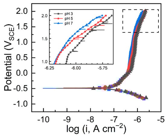 where M is the molar mass of Ti, which is equal to 47.87 g·mol−1 [], n is the charge of the Ti ion, F is the Faraday constant, which is equal to 96,487 C mol−1 [], and ρm is the density of the Ti–6Al–4V alloy, which is 4.43 g cm−3 []. The values of Icorr can be obtained by fitting the PD curves. According to the calculations, the corrosion rates for Ti–6Al–4V under pH 3, pH 5, and pH 7 were 0.2699 × 10−5 mm∙y−1, 0.1769 × 10−5 mm∙y−1, and 0.0935 × 10−5 mm∙y−1, respectively. The Icorr and Ecorr showed opposite tendencies with decreasing pH values, with Icorr increasing, and Ecorr decreasing. This indicates that the decreasing pH values directly influenced Ecorr and facilitated alloy corrosion. It can be concluded that LPBFed Ti–6Al–4V is more susceptible to corrosion in Hank’s solution at pH 3. Furthermore, current transition phenomena were observed in the inset of Figure 2. It is indicated that the passive film is in an unstable state above 1.0 VSCE and prone to pit nucleation on the surface, and the whole phenomenon becomes more pronounced as the pH value decreases. Therefore, the corrosion resistance of LPBFed Ti–6Al–4V has a high potential to lead to metastable pitting corrosion, in addition to declining with lower pH values.