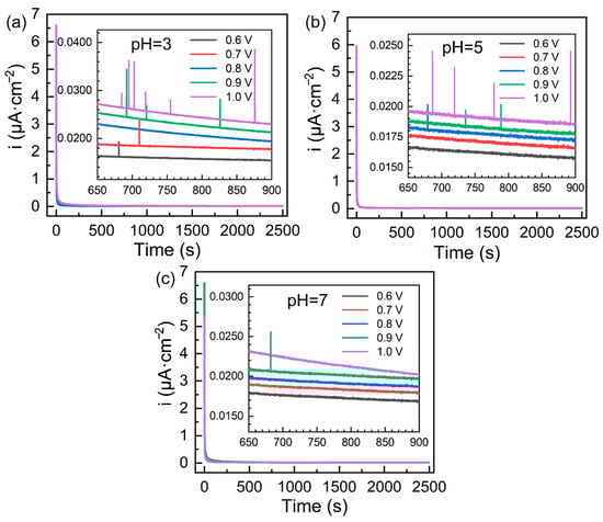 Potentiostatic polarization curves of LPBFed Ti–6Al–4V in Hank’s solution at (a) pH 3; (b) pH 5; and (c) pH 7, under 0.6, 0.7, 0.8, 0.9, and 1.0 VSCE. The enlarged regions from 650 to 900 s are shown in the insets.