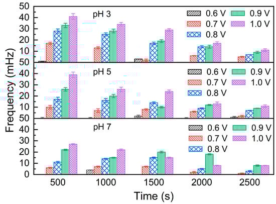 Five different applied potentials (0.6, 0.7, 0.8, 0.9, and 1.0 VSCE) were selected to produce a passive film on the alloy surface in Hank’s solution for 2500 s, which are shown in Figure 3. Figure 3a–c exhibits potentiostatic polarization curves of LPBFed Ti–6Al–4V in Hank’s solution at various pH values. Each curve begins with a sharp decline and, over time, transforms into a horizontal line. Several relevant types of research have shown that this is the result of the growth of a passive film in the early stage, and the gradual stabilization of the passive film growth in the late stage [,,]. Generally, the growth and dissolution of the passive film occur simultaneously, so that the later stable passive film should be in a dynamic equilibrium [,]. After magnifying the pictures, as shown in the insets of Figure 3, the current transition spikes can be distinguished from the background current. The information regarding these current transition spikes, such as nucleation times, durations, nucleation peaks, and so on, can be seen by continuing the amplification, which has been studied in our previous work [] and discussed in detail by Burstein et al. []. It is known that these current transition spikes can go from nucleation to annihilation in seconds or less, which has been attributed to the self-repair of the passive film. Irreversible, stable pitting corrosion will form if the passive film is not repaired in time. Certainly, more current transition spikes mean a greater tendency toward stable pitting corrosion. For convenience, a statistical analysis was performed, to count the current spikes in PP tests at different potentials in the solutions with different pH values. Therefore, the frequency of pit nucleation was counted and plotted in Figure 4, for a more intuitive comparison of pitting corrosion at different pH values. During the statistics, the first 200 s of data were cut, since, during this time the passive film had not been covered completely, and was unstable on the surface of LPBFed Ti–6Al–4V. The 2500 s duration was averaged into 500 s segments, for a total of 5 segments, and then counted. The frequency of each segment, is the ratio of the number of current transition spikes in that segment, to the period. It can be seen that the frequency of pit nucleation decreases as the pH increases. In other words, the lower the pH, the more unstable the passive film becomes, and the probability of pitting corrosion increases.