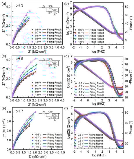 Electrochemical impedance spectroscopy after PP for the LPBFed Ti–6Al–4V, under the potentials of 0.6, 0.7, 0.8, 0.9, 1.0 VSCE in Hank’s solution (pH = 3, 5, 7) at 37 °C. (a,c,e) are Nyquist plots; (b,d,f) are Bode plots.