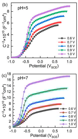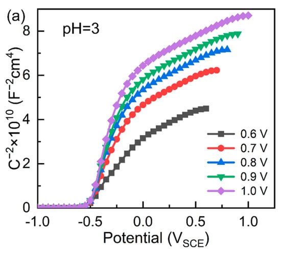 According to the above description, the donor density (ND, mainly for oxygen vacancies) has a relationship with the slope of the Mott–Schottky curve. Then, ND can be calculated based on the n-type semiconductive Mott–Schottky expressions: the slope of the curves equals [], where e is the electron charge (1.6 × 10−19 C). The measured ND is plotted in Figure 7b, and the relationship between ND and the applied potential is obtained by fitting the following equation []: