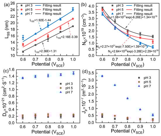 where ω1, ω2, and b are fitting constants in Equation (3), and correspond to the fitted equations in Figure 6b; E is the applied potential. As shown in Figure 6b, ND decreased with increasing potentials and pH. In addition, the diffusion coefficient of vacancy (DO) is another important indicator of the passive film, and the growth kinetics of the passive film also depends on it. The expression for DO is based on the Nernst–Plank transport equation as follows []: