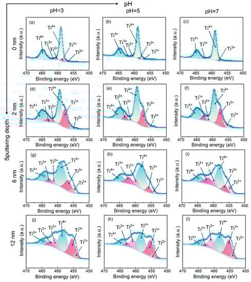 Figure 8 shows the Ti 2p spectra for LPBFed Ti–6Al–4V, after sputtering at 0 nm, 10 nm, 30 nm, and 60 nm, respectively. It can be noticed that the oxide composition of TiO2 reaches its maximum at the outmost layer, for all three pH values. The three valences of Ti ions co-exist in the passive film, while their composition varies with pH and sputtering depth. Table 3 lists the composition distribution of Ti ions in each valence state from Figure 8. The content of TiO2 increases with pH in each depth, while decreasing with the increase in depth. At the surface of the passive film, the fractions of Ti4+, Ti3+, and Ti2+ are 85.72 at%, 9.21 at%, and 5.07 at% in Hank’s solution at pH 3, respectively. In contrast, the fractions of Ti4+, Ti3+, and Ti2+ are 89.67 at%, 5.30 at%, and 5.02 at% in Hank’s solution at pH 5, and 89.91 at%, 5.11 at%, and 4.98 at% in Hank’s solution at pH 7, respectively. The proportion of Ti3+ increased significantly at the sputtering depth of 10 nm. A similar condition is also applied to the fraction of Ti2+ at the sputtering depth of 60 nm, of course along with the decline in Ti4+. According to Gebert et al. [], TiO2 was produced by the gradual transformation of TiO and Ti2O3, so the outmost layer exhibits a passive film dominated by TiO2. Qin et al. [] also performed similar research, they found that the aggressive ions (Cl−) could dissolve the formed TiO2, and inhibit the transformation of TiO and Ti2O3 to TiO2. Therefore, the transformation process of TiO and Ti2O3 to TiO2 is also applied in this work, and this process could also be suppressed by some ions. Accordingly, the inhibitor in this work is H+. A lower fraction of suboxides of Ti2O3 and TiO could be detected over the sputtering depths in Hank’s solution at pH 7, so a thicker passive film formed, in agreement with the results of Figure 7a.
