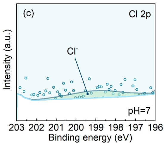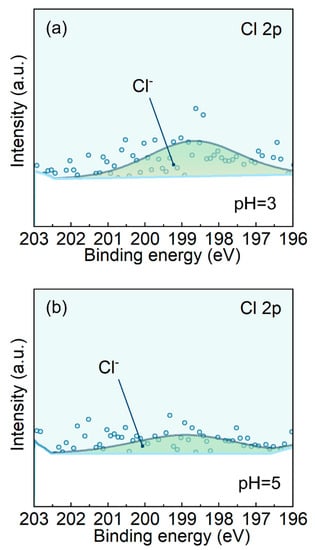 To determine the Cl− adsorption, XPS spectra of Cl 2p for LPBFed Ti–6Al–4V on the surfaces of the passive film have been conducted, and are shown in Figure 9. The potentiostatic polarization tests, under an applied potential of 1.0 VSCE, were performed, while the peak of Cl− is obvious for the sample in Hank’s solution at pH 3. In addition, the larger the value of pH, the less Cl− is adsorbed. It can be concluded, that more Cl− is adsorbed on the surfaces of passive films in Hank’s solution with higher H+ concentration during potentiostatic polarization.