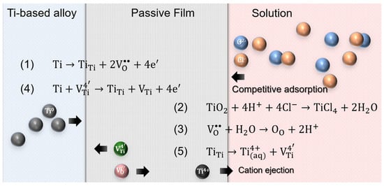Mechanism of the passive film growth and dissolution according to the point defect model: reactions (1–5) are the physicochemical processes that occur on the passive film. is Ti ions in the cation site of the passive film, Vö is oxygen vacancies in the passive film, is Ti ion vacancies in the passive film, is vacancies in the Ti substrate, is an electron, is oxygen ion in the anion site of the passive film, is Ti ions in solution.