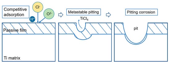 Previously, our work has studied related research on metastable pitting []. That work found that the semiconductive property of the passive film has a relationship with the migration of oxygen vacancies. According to MacDonald’s point defect model (PDM) and the penetration mechanism of the passive film, the adsorption of aggressive ions (such as F−, Br−, Cl−, etc.) from the outside of the film and a large number of oxygen vacancies result in the formation of numerous cation vacancies [,]. The excess cation vacancies condense into a void, namely, a pit. A lot of researchers have also reported similar results before, e.g., Refs. [,,]. However, under certain conditions, such as acidic conditions, the aggressive Cl− ions can squeeze out and occupy oxygen atoms in the passive film. Meanwhile, the metal surface forms a salt film, which is dissolved in solution and accelerates the metal corrosion. In addition, Qu et al. [] demonstrated that titanium is prone to forming a chelate compound ([Ti(OH)3]L) in artificial saliva, with lactic acid, which accelerated passive film dissolution and increased the tendency of pitting corrosion. They proposed that the addition of lactic acid changed the corrosion mechanism and accelerated the pitting corrosion []. Therefore, the passive film reacted with H+ in an acidic environment, then tended to dissolve. As such, the metal surface was transformed from a passive state to an active state. At the moment, the presence of aggressive ions such as Cl− would corrode a single point, resulting in localized corrosion. However, only a few studies have been conducted on the pitting corrosion behavior of metals in acid solutions, let alone metastable pitting corrosion. In addition, interestingly Cl− exerts its aggressiveness more strongly in acidic environments, compared to other environments. Therefore, the focus of this work will be on this area.