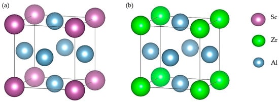 Al3Sc, Al3Zr and Al3(Sc, Zr) are the same crystal structure as Cu3Al(cubic) and belong to the space group L12 (Pm-3 m) at room temperature. Each Al atom is located in the center of four Sc (Zr) atoms in the four-atom primitive cell, as presented in Figure 1. The corresponding positions are as follows: Sc (Zr) at (0, 0, 0) and Al at (0, 1/2, 1/2: 1/2, 0, 1/2: 1/2, 1/2, 0) [27,28].