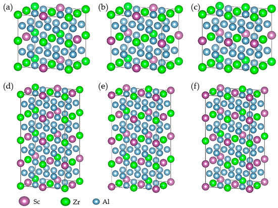 In order to deeply analyze the thermodynamic stabilities of Al3(Sc, Zr), different supercells were constructed by doping Sc into Al3Zr. Considering the different Sc/Zr ratios and atomic occupancies, we used the Pymatgen software package (version 3.7, Materials Virtual Lab, La Jolla, CA, USA) to seek the atomic configurations and performed systematic calculations to find the most stable doping structures. Based on these, 30 Al3(Sc, Zr) models with different doping sites were constructed, and three models with the lowest energy in 2 × 2 × 2 and 2 × 2 × 4 supercells were selected for the following studies. Figure 2 shows the structures of Al3(Sc, Zr) for different doping systems.