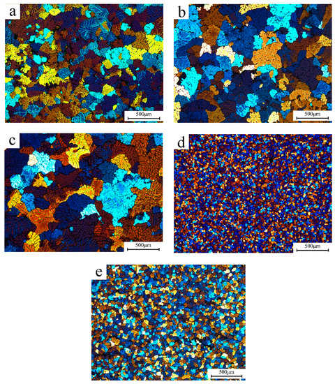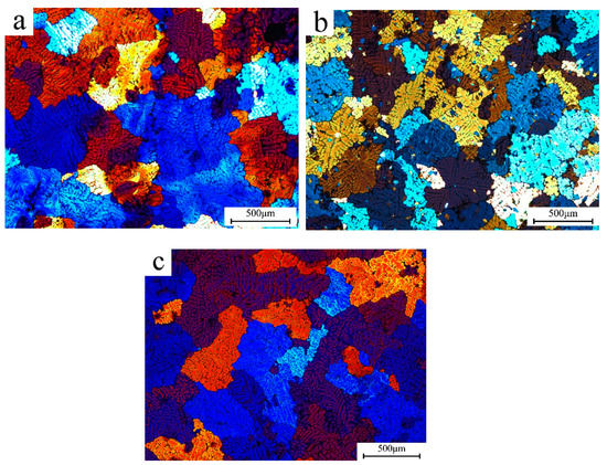The grain structure of as-cast alloys is shown in Figure 3. The as-cast microstructure exhibited a typical dendritic substructure within coarse grains only if there was a single addition of Sc or Zr. It was observed in Figure 3b,c that the grain size was slightly modified by the addition of 0.27 wt.% Sc or 0.27 wt.% Zr. The results indicated that the grain refinement was very weak. Figure 4 presents the average grain size of Al-Mg-Zn alloy with the single addition of Sc and Zr. It was observed that the grain size of Al-Mg-Zn without a trace element (Figure 3a) was 297 μm, while the average grain size was 197μm with adding 0.27 wt.% Sc (Figure 3b), and the alloy with adding 0.27 wt.% Zr (Figure 3c) was 260 μm. It can be suggested that the addition of 0.27 wt.% Zr did not result in grain refinement significantly. So, the single addition of Sc has a better grain refining effect compared to the addition of Zr. However, for the coarse structure of the alloy with 0.27 wt.% Sc, the addition of 0.27 wt.% Sc content was still not enough to form primary Al3Sc particles in the melt, although the existence of Mg and Zn was found to decrease the solubility of scandium in solid solution [29], which supported the results of this study. Therefore, the grain was not obviously refined with the single addition of Sc or Zr. Then, we studied the grain structure of as-cast alloys by adding Sc and Zr simultaneously.