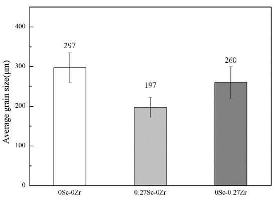 The grain structure of as-cast alloys is shown in Figure 3. The as-cast microstructure exhibited a typical dendritic substructure within coarse grains only if there was a single addition of Sc or Zr. It was observed in Figure 3b,c that the grain size was slightly modified by the addition of 0.27 wt.% Sc or 0.27 wt.% Zr. The results indicated that the grain refinement was very weak. Figure 4 presents the average grain size of Al-Mg-Zn alloy with the single addition of Sc and Zr. It was observed that the grain size of Al-Mg-Zn without a trace element (Figure 3a) was 297 μm, while the average grain size was 197 μm with adding 0.27 wt.% Sc (Figure 3b), and the alloy with adding 0.27 wt.% Zr (Figure 3c) was 260 μm. It can be suggested that the addition of 0.27 wt.% Zr did not result in grain refinement significantly. So, the single addition of Sc has a better grain refining effect compared to the addition of Zr. However, for the coarse structure of the alloy with 0.27 wt.% Sc, the addition of 0.27 wt.% Sc content was still not enough to form primary Al3Sc particles in the melt, although the existence of Mg and Zn was found to decrease the solubility of scandium in solid solution [29], which supported the results of this study. Therefore, the grain was not obviously refined with the single addition of Sc or Zr. Then, we studied the grain structure of as-cast alloys by adding Sc and Zr simultaneously.