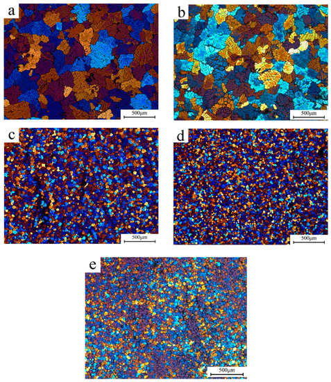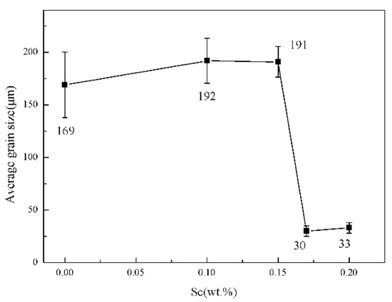 The grain structure of as-cast alloys with Sc and 0.1 wt.% Zr is shown in Figure 5. The dendritic substructure with coarse grain was obvious in the alloys of 0 wt.% Sc, 0.1 wt.% Sc and 0.15 wt.% Sc (Figure 5a–c), whereas the equiaxed structure was found in the alloy with 0.17 wt.% Sc and 0.20 wt.% Sc (Figure 5d,e). The as-cast grains were refined significantly while the mass percentage of Sc was less than 0.17. Figure 6 displays the evolution of the average grain size, calculated using the standard linear intercept method. The average grain sizes of as-cast alloy with 0 wt.% Sc, 0.1 wt.% Sc and 0.15 wt.% Sc were 169, 192 and 191 μm, respectively. The results showed that the grain refinement degree was weak when adding a low content of Sc and Zr elements. This was probably because there are not enough cores formed in the melt to refine the grains. However, the average grain sizes of as-cast alloy with 0.17 wt.% Sc and 0.20 wt.% Sc ranged from 30 to 33 μm. This indicated that with the increase of the Sc content, the average grain size decreased further, so that the benefit of grain refinement was greater. It was easy to see that when the total mass fraction of Sc and Zr was not less than 0.27, the as-cast structure of the alloy was obviously refined. Thus, we studied the grain structure of as-cast alloys with different Sc to Zr ratios while the total mass percentage of Sc and Zr was 0.27.