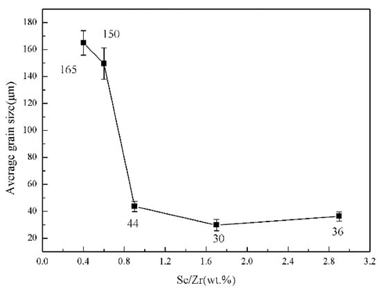 The grain structure of as-cast alloys with different Sc to Zr ratios while the total mass fraction of Sc and Zr was 0.27 is shown in Figure 7. The as-cast grains were refined with a Sc to Zr ratio ranging from 0.9 to 2.9, whereas the as-cast alloy exhibited coarse grains in which the Sc to Zr ratio was less than 0.6. Figure 8 shows the evolution of the average grain size. The average grain size of the as-cast alloy ranged from 150 to 165 μm when the Sc to Zr ratio was 0.35 and 0.6, respectively. In contrast, when the Sc to Zr ratio was more than 0.9, the as-cast grains can be significantly reduced even at a lower Zr level, in which the average grain size was between 30 and 44 μm. According to the above results, the grain refinement effect of the composite addition of Sc and Zr was higher than that of the single addition of Sc or Zr. Meanwhile, the composite addition of Sc and Zr can effectively reduce costs. Considering the cost factor, we considered the alloy with 0.13 wt.% Sc and 0.14 wt.% Zr as a typical alloy for the study.