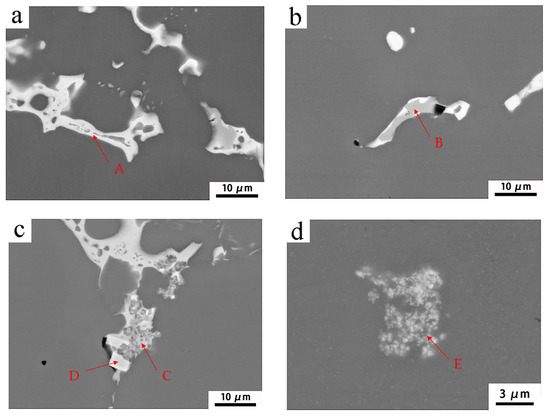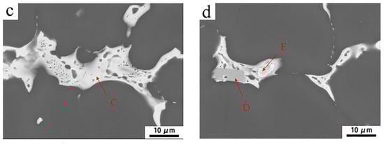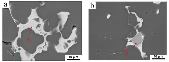 The microstructure of as-cast alloy was studied using a scanning electron microscope (SEM), and the influence of Sc and Zr addition to the alloy was investigated. We selected the base alloy, the alloy with 0.07 wt.% Sc and 0.20 wt.% Zr (grains not refined significantly) and alloy with 0.13 wt.% Sc and 0.14 wt.% Zr (grains refined significantly) as the research objects. Figure 9 presents the second phase of the base alloy (Figure 9a,b) and the alloy with 0.07 wt.% Sc and 0.20 wt.% Zr. The EDS results are shown in Table 2. In the terms of SEM observations and EDS results, the T-Al6Mg11Zn11 phase (bright contrast) was along grain boundaries in the α-Al (fcc) matrix (dark contrast). There were some massive white Mn-rich phases in the base alloy. However, Al3(Sc, Zr) phase was not observed in the as-cast alloy.