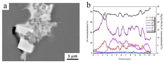 In order to further clarify the complex structure, primary particle samples showing more details of microstructure were selected for study, and the results are shown in Figure 11. From the results of line scan elements analysis, it can be seen that the primary Al3(Sc, Zr) phase had a layered structure of “Al3(Sc, Zr) + Al + Al3(Sc, Zr)” from two-dimensional space observation, which was similar to the experimental results reported by Forbord [30].