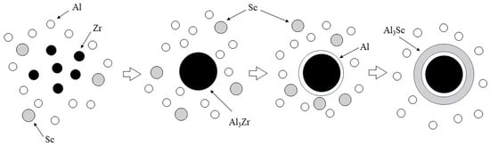 Considering the difference in the actual casting process, the grain size of Al-5.0Mg-3.0Zn alloy was divided into three gradients. The grain size of the base alloy was 300 μm; after adding Sc and Zr, the grain size was between 150 to 200 μm. When the total mass fraction of Sc and Zr was not less than 0.27, and the mass fraction of Sc was more than 0.13, the as-cast grains can be significantly refined, and the average grain size ranged from 20 to 40 μm. Figure 12 shows the formation of Al3(Sc, Zr) during solidification. Al3Zr particles were formed firstly under a temperature above 650 °C. Once peritectic particles (Al3Zr) were formed, further solidification was controlled by a peritectic reaction to form an Al layer: Al3Zr + liquid → Al. The Al layer can be used as the nucleation surface of the initial eutectic reaction: liquid→α-Al+Al3Sc [23]. This is owing to the very close orientation relationship and very small lattice mismatch between Al (fcc, a = 0.4050 nm) and Al3Sc (L12, a = 0.4105 nm), which promoted the nucleation of Al3Sc on Al. However, Wang [21] suggested that the Al3Zr nucleated preferentially; then, Al3Sc was covered at the surface of Al3Zr particles. Finally, Al3(Sc, Zr) particles with a layered structure were formed. The next step was α-Al nucleation by Al3(Sc, Zr) particles. Although there was some controversy, it was recognized that Al3Zr particles formed firstly during the solidification process.