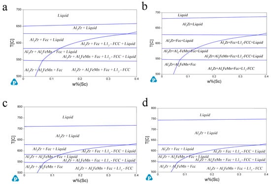 Phase diagram calculation results of Al-5.0Mg-3.0Zn-0.5Mn-xZr alloy with different Sc content: (a) 0.07Zr; (b) 0.1Zr; (c) 0.14Zr; (d) 0.20Zr.