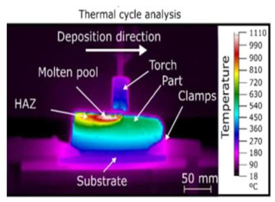 The metallographic and mechanical characteristics of parts manufactured by WAAM using gas metal arc welding (GMAW) and plasma arc welding (PAW) indicated that PAW is slightly increased in elongation and toughness compared to GMAW [26], which could be due to the difference in the thermal input. The concept of welding simulation is very supportive for both WAAM and the welding process because, in both cases, metals are melted to build the parts. Due to the thermal cycle in the melting process, RS and distortion lead to non-uniform contraction and expansion mechanisms in the materials [27]. Figure 1 [28] illustrates the region where the melting front in the WAAM process is heated up sharply and lets the material fuse locally during the process of deposition, in a similar fashion as the arc welding process [29].