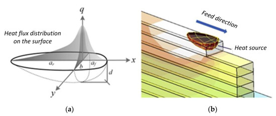 Illustration of (a) parameters of heat source volume with double ellipsoidal shape and (b) heat source movements and activation approach of mesh elements in the simulations (Reprinted from ref. [11]. Copyright 2019, Elsevier, in accordance with CC BY license, open access).