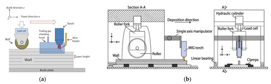 (a) Illustration of the combination of a rolling step sequentially with layer deposition and minimizing RS in the WAAM process (Reprinted with permission from ref. [121]. Copyright 2018. Elsevier, in accordance with CC BY license, Open access); and (b) Schematic illustration of rolling on printing and with clamps equipment (Reprinted with permission from ref. [122]. Copyright 2013. Elsevier, License Number-5493060104979).