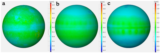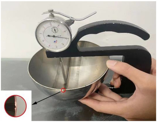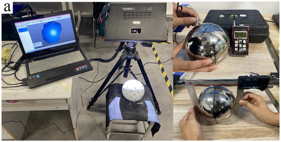 Dimensional measurements are carried out to evaluate the variance of shell thickness. On one hand, 3D scanning is conducted by an industrial-grade 3D scanner with a scanning accuracy of 0.02 mm from Open Technologies, and 50 measuring points are distributed randomly on the surface of each spherical shell. On the other hand, 8 longitudes and 6 latitudes are uniformly distributed on the surface of the spherical shell, and the thickness at all the cross points is measured by a non-destructive ultrasonic thickness gauge. The 3D scanning and thickness measurement test sites are shown in Figure 2a,b.