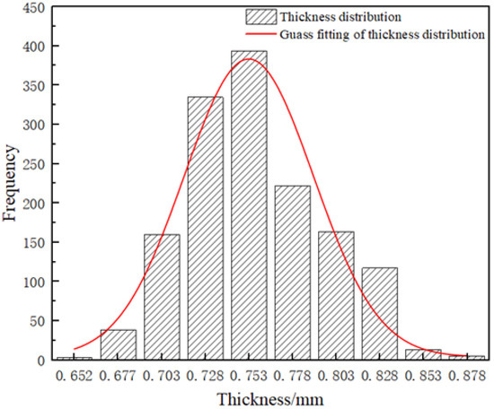 The scanning results are compared with the corresponding nominal structural dimensions, and three typical comparisons are shown in Figure 3. The stochastic characteristics of thickness are listed in Table 1, and the statistical distribution of thickness is shown in Figure 4.