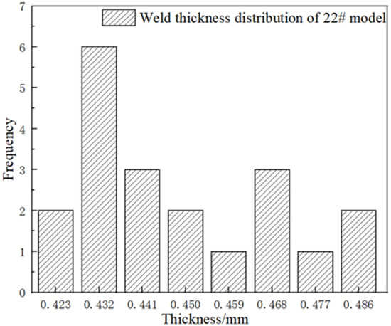 In order to check the inside morphology, all spherical shells are cut up after collapse. To account for the effect of welding on structural performance, the thickness in the welding region is also measured in this section. The stochastic characteristics of thickness, as well as its comparison with that in the main body, are listed in Table 2. Meanwhile, the distribution of thickness in the welding region of a typical shell (22#) is shown in Figure 5.