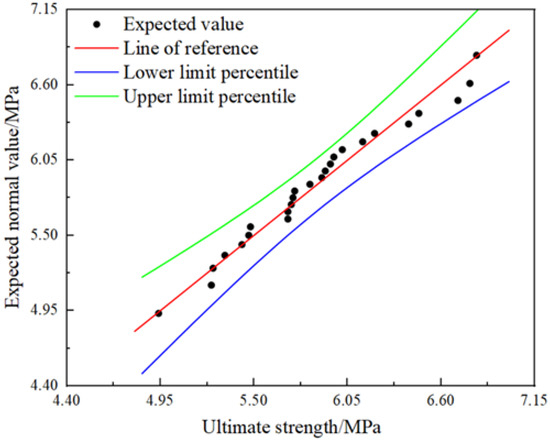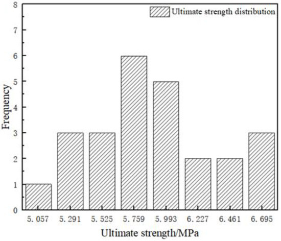Due to the variation in material properties and shell thickness, as well as uncertain factors caused by manufacturing, the ultimate strength of the nominally identical spherical shells can be different from each other. The histogram of measured ultimate strength shown in Figure 8 is approximately subordinate to a logarithm normal distribution. Meanwhile, in Figure 9, the ultimate strength values are distributed closely on both sides of the reference line, which indicates a good consistency between the measured and the expected normal values. The mean value and standard deviation of the measured ultimate strength are 6.019 MPa and 0.580 MPa, respectively. The variation coefficient of the tested ultimate strength is 9.64%, indicating an obvious randomness of the nominally identical spherical shells.