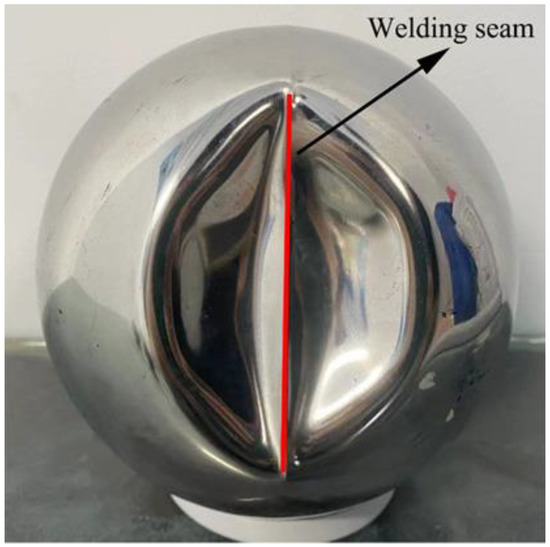 The thickness in the welding area is thinned and randomly distributed compared to that in the main body because of fusion in the welding process. An obvious welding seam with about a 6 mm width, symmetrically distributed on both sides of the interface, can be seen in the welding area in Figure 6. In addition, a crack-shaped free edge exists on the inner side of the seam due to the fact that this site cannot be welded directly. For experimental results of different spherical shells listed in Table 2, the mean value of the thickness in the welding region is about 0.545 to 0.736 times that in the main body. However, the measured thickness in the welding region shown in Figure 6 varies randomly, and it cannot be fitted by a normal distribution. The influence of thickness thinning caused by welding will be investigated in the following section.