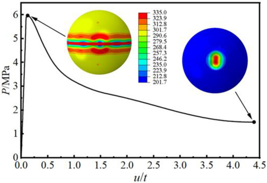 The collapse mode shown in Figure 12 is identical to the experimental result shown in Figure 10. The point of maximum displacement is located on the welding interface. The abscissa is defined as the maximum displacement to thickness ratio of the main body (u/t) to show the amount of displacement more intuitively. With the increase in abscissa, the equilibrium curve rises sharply in a narrow range, and then falls slowly after the pressure reaches ultimate strength. In addition, the maximum stress occurs in the welding region, according to the stress distribution at the critical load point. By combining the stress distribution and collapse mode, a smaller stiffness in the welding region can be inferred relative to that in the main body.