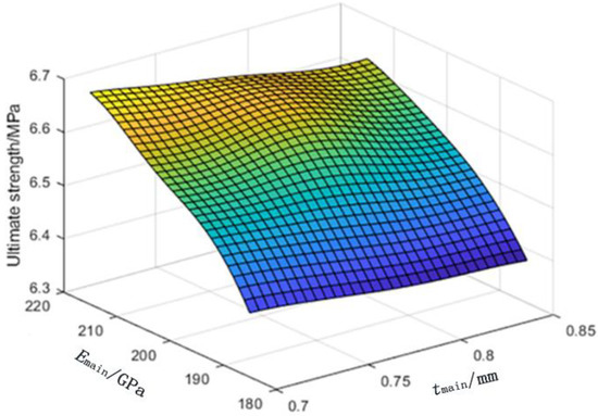 The established GP model of ultimate strength is highly nonlinear, but exhibits excellent precision. As is shown in Figure 13, the ultimate strength varies nonlinearly over the design space of uncertain parameters. Meanwhile, from Table 5, the determination coefficient R2 of the GP model for the modeling and prediction sample groups are 1.0 and 0.998, respectively. In addition, the RMSE of the model for the two sample groups is 2.138 × 10−14 and 0.008, respectively. The R2 is close to 1, and the RMSE is close to 0, indicating an excellent reproduction and prediction capability of the established GP model. As a result, the established GP model is accurate enough to replace the finite element model to predict the ultimate strength in further uncertainty analysis.