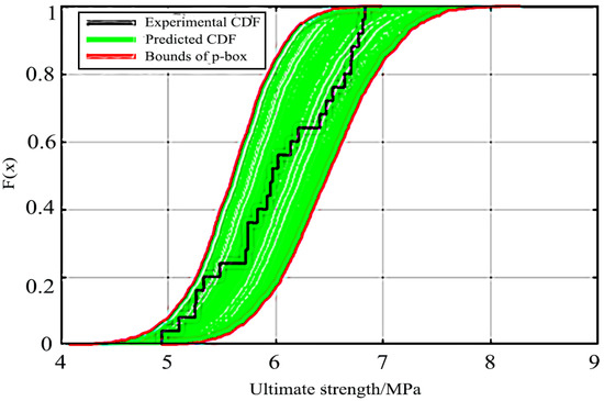 Moreover, in both case I and case II, the comparison of predicted CDFs and experimental empirical CDF is conducted under the concept of uncertainty, and no point-to-point error is calculated directly. Obviously, the comparison of CDFs and their stochastic characteristics covers a wider range. As a result, the occasionalities or erroneous judgment caused by simulation and experimental results can be avoided. Furthermore, from the p-box of ultimate strength, the bounds of probability distributions are determined, and the corresponding results can be used for further research, such as for credibility analysis and engineering decisions.