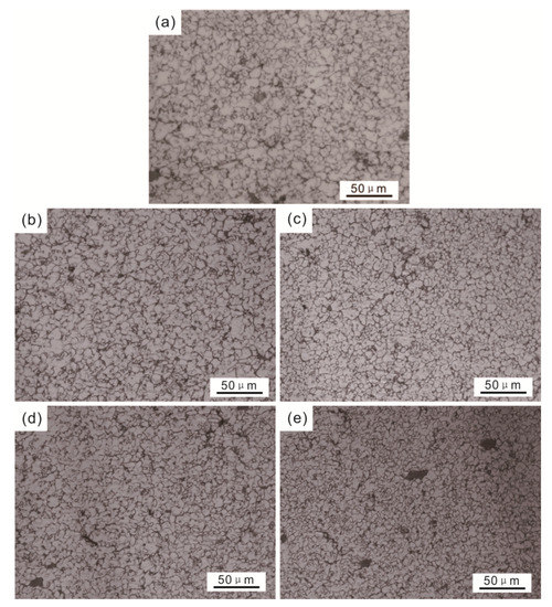 In order to characterize the microstructure of Ta-W alloy and explore the effects of plasma sintering, tungsten content and mechanical alloying on the microstructure of Ta-W alloys, all the experiments had used the MM-2C optical microscope (Hengshengfeng Technology of Shenzhen, Shenzhen, China) to observe the microstructure of Ta-W alloy. The metallographic samples were processed into a size of 5 × 5 × 4 mm by wire-cutting machine and then were inserted in thermosetting resin. The D/MAX-RBRU X-ray diffractometer (XRD) (PANalytical B.V., Almelo, Netherlands) was used to analyze the phase of Ta-W alloy samples. The Kα radiation of Cu target (λ = 1.54059 Å) was used in the diffractometer test and the scanning angle range was 30–90 degrees, while the tube voltage was 40 KV, and the tube current was 250 mA.