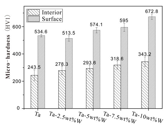 The micro-hardness of different regions in Ta-W alloy sintered by SPS are quite different. In Figure 5, the internal micro-hardness and external micro-hardness of the Ta-W alloys with different content of W are concluded. The interior hardness of Ta-W alloy increases with the increased tungsten content in Ta-W alloy. While the tungsten content is 2.5 wt%, contrast to the pure tantalum, the surface hardness of Ta-W alloy fabricated by SPS has decreased slightly. But when the addition amount of tungsten is more than 2.5%, the surface hardness of Ta-W alloys increases with the increased tungsten content significantly. Besides, the hardness of the surface is much higher than of the core.
