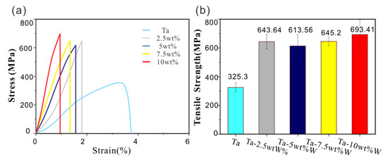 Tensile test (a) stress-strain curves of Ta-W alloy, (b) tensile strength of Ta-W alloy.