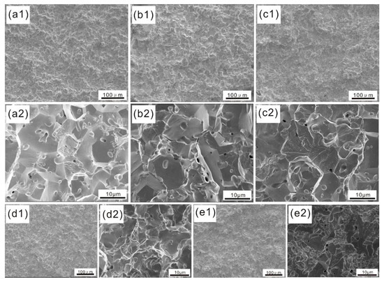 Tensile fracture section morphology of Ta-W alloy with different W contents (a1,a2) Pure Ta, (b1,b2) Ta-2.5 wt%W, (c1,c2) Ta-5 wt%W, (d1,d2) Ta-7.5 wt%W, (e1,e2) Ta-10 wt%W.