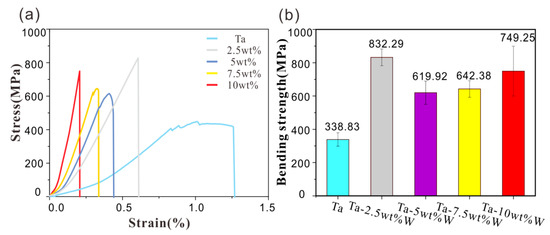 The flexural stress-strain curve (a) and ultimate flexural strength (b) of tantalum tungsten alloy with different tungsten contents.